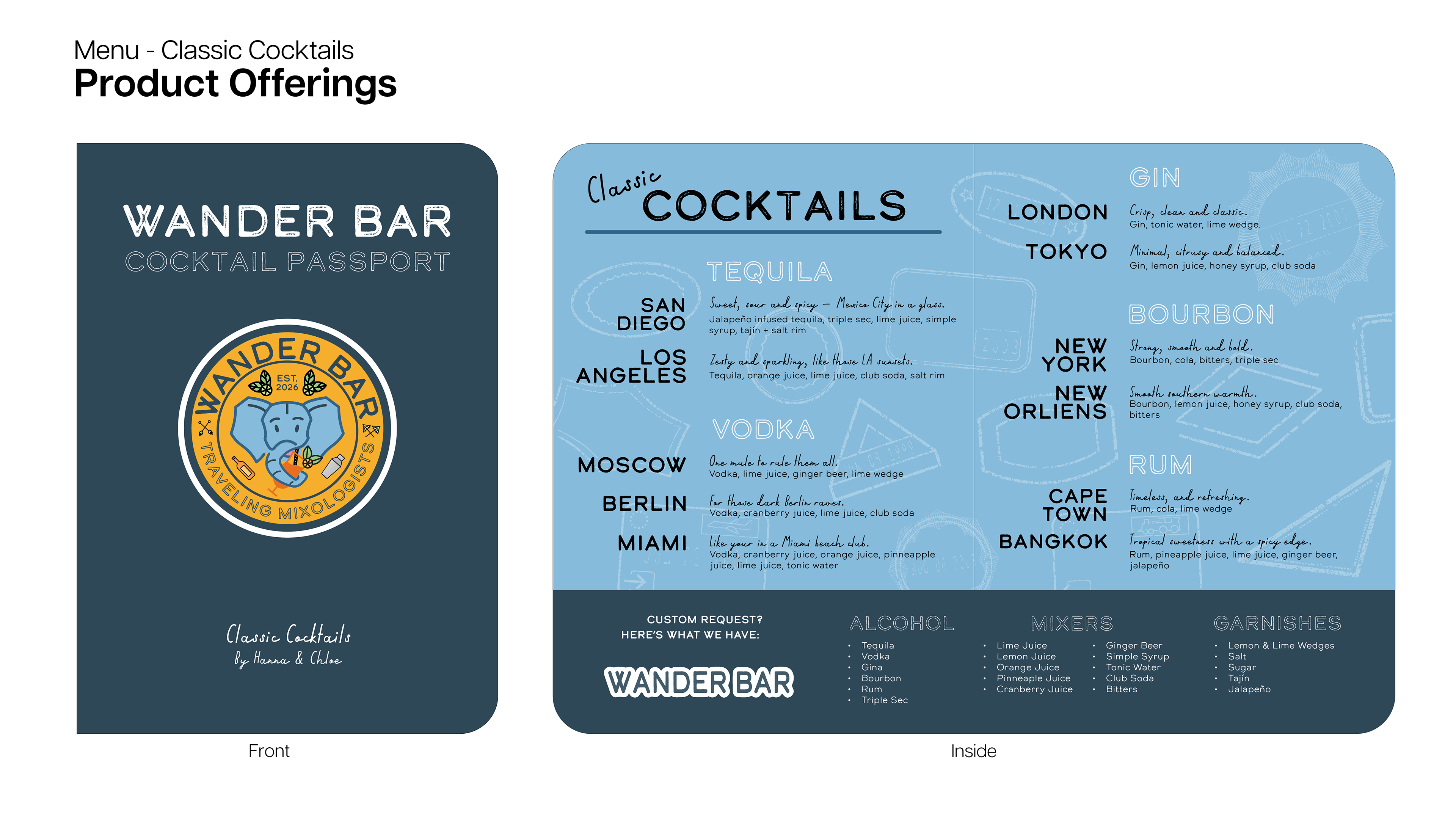Project for San Diego Based Mobile Bartending service. Created Brand guidelines, a logo, and designed product offerings that matched with the brand's goal to match the vibes of wanderlust and travel